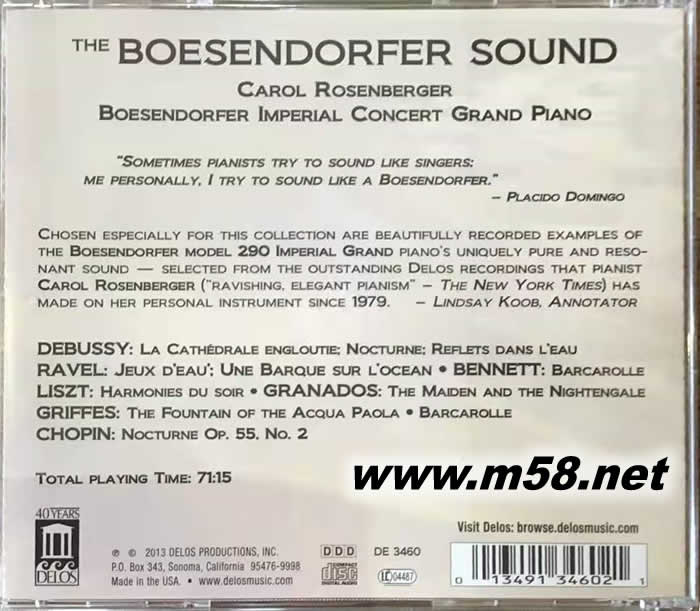 動態(tài)琴皇 - 貝森朵夫之聲/卡洛羅森貝格/鋼琴極品(m58.net) 聞名世界的貝森朵夫鋼琴廠歷史可溯及 1827 年,是世界上最古老的鋼琴製造商之一,也見證了音樂之都─奧地利維也納的音樂藝術(shù)與精湛工藝,自 1839 年起便為歐洲諸多皇室提供頂級三角鋼琴;不同於一般鋼琴商僅製作 88 鍵的鋼琴,貝森朵夫曾為了因應(yīng)管風(fēng)琴曲的低音需求,創(chuàng)造出 97 鍵的鋼琴,命名為貝森朵夫 290 皇家三角鋼琴,並蔚為經(jīng)典。 著名的美國鋼琴家兼 Delos 總裁卡洛.羅森貝格,這 次,她在貝森朵夫 290 皇家三角鋼琴上再次展演出多位印象派大師的杰作,如星月交輝的燦爛美感,照耀著聆聽者的心靈!