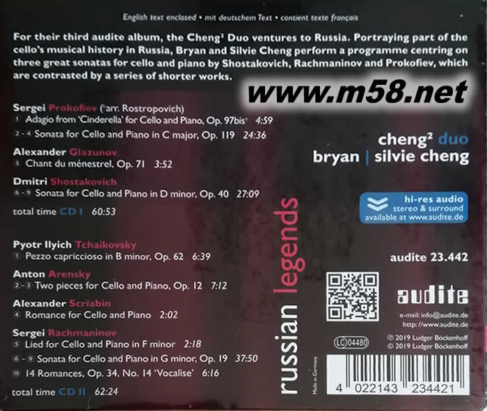Russian Legends 俄羅斯大提琴(m58.net) 清新風格, 默契十足 ; 精彩演繹: 普羅高菲夫/葛拉祖諾夫/肖斯塔高維契/柴可夫斯基/阿瑞斯基/斯克里亞賓/拉赫曼尼諾夫 之大提琴奏鳴曲; 銘琴 史特拉第瓦里(Strad.) 靚聲演繹,非同凡響 同步發行: <西班牙大提琴>(AUD97736 )/ <法蘭西大提琴>(AUD97698,) ;德國原裝進口