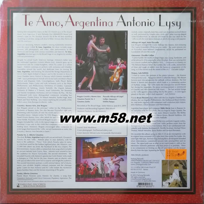 [愛你, 阿根廷]Te Amo, Argentina 爵士三重奏(大提琴、鋼琴、低音吉它) 黑膠(m58.net) Antonio Lysy (大提琴) Bryan Pezzone (鋼琴) Pablo Motta (低音結(jié)他) <雅魯唱片(Yarlung Records)>是現(xiàn)今美國(guó)新興發(fā)燒古典音樂廠牌,由老板兼著名錄音師錄音師鮑勃.阿蒂雅(Bob Attiyeh)負(fù)責(zé)錄音製作同時(shí)亦與史蒂夫.霍夫曼(Steve Hoffman)共同作母盤處理,而黑膠製作則請(qǐng)來著名母盤制作猛人道格.薩克斯(Doug Sax)與桑格伍克.南(Sangwook Nam)操刀,無論音樂與音效皆達(dá)致最高水平。國(guó)際知名的大提琴大師安東尼歐.李西(Antonio Lysy)的<阿根廷作曲家作品(Antonio Lysy at the Broad:Music from Argentina)>更榮獲「2010年第11屆拉丁格萊美—最佳古典當(dāng)代音樂獎(jiǎng)(Latin Grammy Award—Best Classical Contemporary Composition)」、同時(shí)亦入選<音響論壇>總編—?jiǎng)h盛「黑膠專書」推介、而資深黑膠達(dá)人邁克爾.弗梅爾(Michael Fremer)推許本專輯在音樂、音響性皆給予超越滿分的激賞。得到專業(yè)音樂界別一致好評(píng),備受全球矚目。李西的最新錄音,聯(lián)同鋼琴家布萊恩.裴通尼(Bryan Pezzone)、低音吉他手保羅‧莫塔(Pablo Motta)與及”首都樂團(tuán)(Capitol Ensemble)”合力演繹多位阿根廷作曲家的著作,