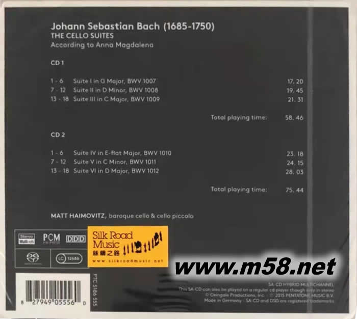 巴哈:給大提琴獨奏的六首組曲 Bach:The Cello Suites 雙SACD(m58.net) 海默維茨<巴哈:6首無伴奏大提琴組曲>2SACD,曾獲得<格林美>最佳古典跨界音樂專輯提名的大提琴家海默維茨分別以巴洛克大提琴及高音大提琴演繹,驚人的技巧令人嘆為觀止。銳不可擋的獨奏演繹配合最傳真、最專業的高規格錄音制式制作,帶來全新感覺的巴哈組曲!