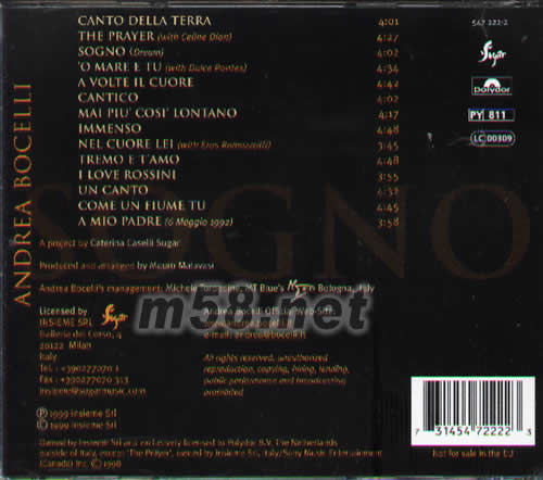 1. CANTO DELLA TERRA 2. THE PRAYER(with Celine Dion) 3. SOGNO(Dream) 4. 'O MARE E TU(with Dulce Pontes) 5. A VOLTE IL CUORE 6. CANTICO 7. MAI PIU'COSI' LONTANO 8. IMMENSO 9. NEL CUORE LEI(with Eros Ramazzotti) 10. TREMO E T'AMO 11. I LOVE ROSSINI 12. UN CANTO 13. COME UN FIUME TU 14. A MIO PADRE(6 Maggio 1992)