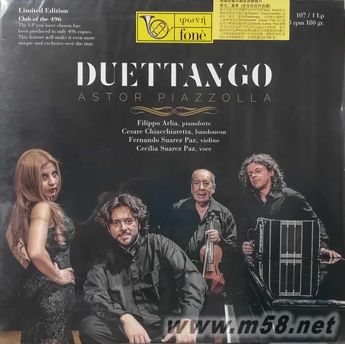 探戈二重奏[皮亞佐拉作品選]Duettango [Astor Piazzolla] 黑膠(m58.net) Filippo Arlia (pianoforte)、Fernando Suarez Paz (violin)、 Cesare Chiacchiaretta, (bandoneon)、Cecilia Suarez Paz (vocal) 向皮亞佐拉致敬集,十二首的不朽名作 鋼琴+小提琴+手風琴+女聲 將皮亞佐拉的作品以最接近原貌重現(xiàn), 越聽越有味道 1. 意大利當代年青鋼琴家菲利普•阿利亞(Filippo Arlia)與手風琴家切薩雷•奇亞切雅烈達(Cesare Chiacchiaretta)於2008年成立二人組合「探戈二重奏(Duettango)」,他倆利用各自擅長的樂器致力探索和推廣探戈音樂,特別是探戈圖騰皮亞佐拉(Astor Piazzolla)的作品,他們如對話般的演奏別樹一格,可圈可點,贏得不少喝采聲。 2. 他倆伙拍馳名國際的小提琴奏家費爾南多•蘇亞雷斯•巴斯(Fernando Suarez Paz)及巴斯的女兒歌唱家塞西妮亞(Cecilia Suarez Paz)演繹十二首皮亞佐拉的不朽名作向這位大師致敬。 3. 阿利亞的鋼琴鏗鏘俐落配合奇亞切雅烈達矯揉圓滑的手風琴和巴斯輕鬆自然,線條分眀的小提琴演奏,加上塞西妮亞那磁性帶點沙唖卻充滿拉丁口味的歌唱,將皮亞佐拉的作品以最接近原貌重現(xiàn),越聽越有味道。 4. LP : 著名錄音師里茲(Giulio Cesare Ricci)負責由錄音至母盤製造和壓片工序整個過程期間不作任何加強、調整和更改(one-stage pressing process),是純自然的模擬錄音(pure analogue natural sound recording)。在德國壓製的33轉180克處女黑膠唱片,全球限量出版496張,是聆聽另一名盤。 5. SACD : 著名錄音師里茲(Giulio Cesare Ricci)負責由錄音至母盤製造,配合以SACD為載體,無論是音場的高度、闊度和深度、對位和音響的清晰度等,皆達致最高規(guī)格,現(xiàn)場立體感十足,是獨一無二的鑑賞名盤。