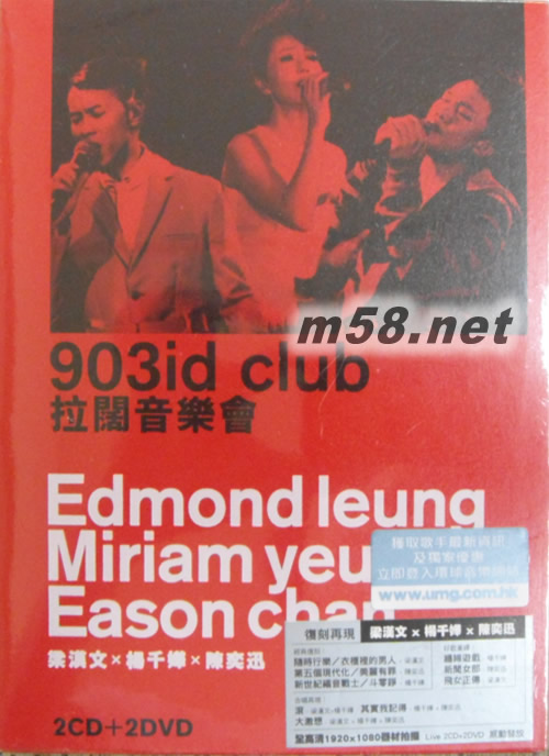 903 id club 陳奕迅x 楊千嬅x 梁漢文Music Is Live 2011(2 DVD + 2 CD)(m58.net) 「華星三寶」再現(xiàn)舞臺(tái),2011年7月7日登陸香港會(huì)議展覽中心,舉行拉闊音樂(lè)會(huì)!陳奕迅、楊千嬅與梁漢文破天荒同臺(tái)發(fā)聲,互唱華星唱片年代的經(jīng)典流行曲,包括∶楊千嬅演繹的「纏綿游戲」、陳奕迅唱的「新聞女郎」和梁漢文唱的「飛女正傳」,三人還有合唱1998年廣告快歌「大激想」和多首精選歌。音樂(lè)會(huì)當(dāng)然不少得三寶演唱不同時(shí)期的好歌,梁漢文選唱「隨時(shí)行樂(lè)」和「衣柜里的男人」,陳奕迅再次演繹「第五個(gè)現(xiàn)代化」和「美麗有罪」,至于楊千嬅則點(diǎn)選「新世紀(jì)福音戰(zhàn)士」和「斗零踭」,為現(xiàn)場(chǎng)觀眾帶來(lái)不少集體回憶。
