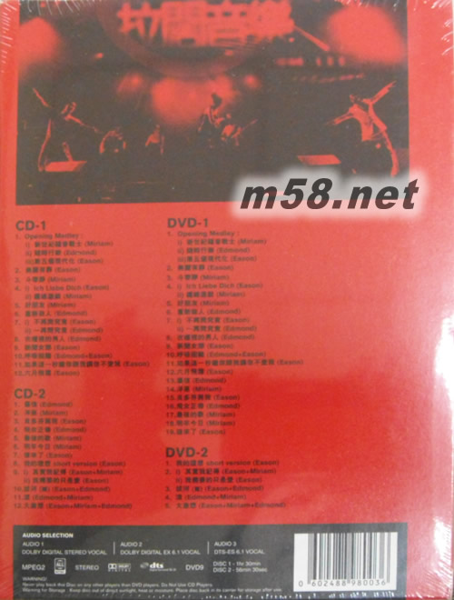 DVD 1 1. Opening Medley : i) 新世紀(jì)福音戰(zhàn)士(Miriam) ii) 隨時(shí)行樂(lè)(Edmond) iii) 第五個(gè)現(xiàn)代化(Eason) 2. 美麗有罪(Eason) 3. 斗零踭(Miriam) 4. i) Ich Liebe Dich (Eason) ii) 纏綿游戲(Miriam) 5. 好朋友(Miriam) 6. 重新做人(Edmond) 7. i) 不再問(wèn)究竟(Eason) ii) 一再問(wèn)究竟(Edmond) 8. 衣柜里的男人(Edmond) 9. 新聞女郎(Eason) 10. 呼吸困難(Edmond+Eason) 11. 如果這一秒鐘你跟我講你不愛(ài)我 (Eason) 12. 六月飛霜(Eason) 13. 傷信(Edmond) 14. 洋蔥(Miriam) 15. 貝多芬與我(Eason) 16. 飛女正傳(Edmond) 17. 最后的歌(Miriam) 18. 明年今日(Miriam) 19. 狼來(lái)了(Eason) DVD 2 1. 我的理想short version (Eason) 2. i) 其實(shí)我記得(Eason+Miriam) ii) 我需要的只是愛(ài)(Eason+Miriam) 3. 拔河(國(guó)) (Eason+Edmond) 4. 滾(Edmond+Miriam) 5. 大激想(Eason+Miriam+Edmond) CD 1 1. Opening Medley : i) 新世紀(jì)福音戰(zhàn)士(Miriam) ii) 隨時(shí)行樂(lè)(Edmond) iii) 第五個(gè)現(xiàn)代化(Eason) 2. 美麗有罪(Eason) 3. 斗零踭(Miriam) 4. i) Ich Liebe Dich (Eason) ii) 纏綿游戲(Miriam) 5. 好朋友(Miriam) 6.. 重新做人(Edmond) 7. i) 不再問(wèn)究竟(Eason) ii) 一再問(wèn)究竟(Edmond) 8. 衣柜里的男人(Edmond) 9. 新聞女郎(Eason) 10. 呼吸困難(Edmond+Eason) 11. 如果這一秒鐘你跟我講你不愛(ài)我 (Eason) 12. 六月飛霜(Eason) CD 2 1. 傷信(Edmond) 2. 洋蔥(Miriam) 3. 貝多芬與我(Eason) 4. 飛女正傳(Edmond) 5. 最后的歌(Miriam) 6. 明年今日(Miriam) 7. 狼來(lái)了(Eason) 8. 我的理想short version (Eason) 9. i) 其實(shí)我記得(Eason+Miriam) ii) 我需要的只是愛(ài)(Eason+Miriam) 10. 拔河(國(guó)) (Eason+Edmond) 11. 滾(Edmond+Miriam) 12. 大激想(Eason+Miriam+Edmond)