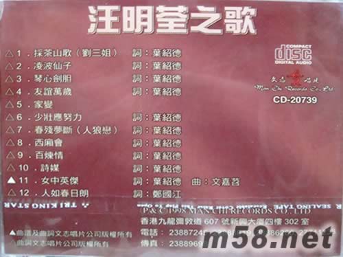 01. 采茶山歌(劉三姐) 02. 凌波仙子 03. 琴心劍膽 04. 友誼萬歲 05. 家變 06. 少壯應努力 07. 春殘夢斷(人狼戀) 08. 西廂會 09. 百煉情 10. 詩媒 11. 女中英杰 12. 人如春日朗