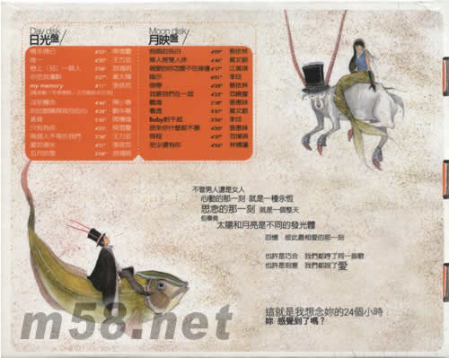 價格為估,以實到貨為準! 愛情保鮮盒 日光盤 月映盤(m58.net) 不管男人還是女人 心動的那一刻 就是一種永恒 思念的那一刻 就是一個整天 但畢竟 太陽和月亮是不同的發光體 還記得 男人與女人 一起走向一顆大樹 放入 各自的心情 約好了 某年某月的同一天 要一起打開時光保盒 回憶 彼此最相愛的那一刻 也許是巧合 我們都放入了同一首歌 也許是刻意 我們都說了 愛 這就是我想念你的24個小時 你感覺到了嗎? 這張碟似乎不能被定義為精選集,全碟歌曲以SONY唱片旗下歌手演唱的歌曲為主,分為日光盤和月映盤。其中日光盤中收錄12首男歌手演唱經典曲目,每首歌代表從早上5點開始一直到下午四點這段天光時的每一個小時。收錄歌曲包括張信哲招牌K歌“愛如潮水”,鄭中基“你的眼睛背叛你的心”,以及王力宏“唯一”,“兩個人不等于我們”等歌曲。而月映盤就收錄了12首由女歌手演唱,代表晚上12個小時的歌曲,可謂新意十足。收錄歌曲包括林憶蓮大熱金曲“至少還有你”,李玟實力情歌“暗示”,蔡依林“假面”牛仔褲廣告歌“假面的告白”等一系列經典曲目。就像專輯名字一樣,經典的情歌就像愛情的保鮮盒,愛情或許不能永遠鮮活,可是一首經典的情歌卻能永駐人們心中。