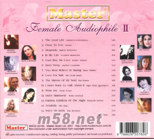 明達發燒女聲天碟II(m58.net) 精挑細選15首經典作品,由15位發燒級靚聲天后演繹,超過70多分鐘的美聲歌集,全部經混音再造,將錄音效果推至完美境界,歌聲通透,樂器定位清晰,立體鮮明,再創發燒女聲試音天碟新典范!