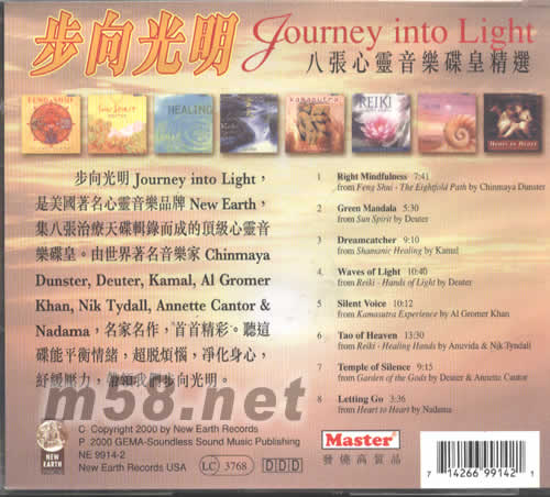 步向光明JOURNEY INTO LIGHT,是美國著名心靈音樂品版, NEW EARTH ,集八張治療天碟輯錄而碭頂級(jí)心靈音樂碟皇。由世界著名音樂家CHINMAYA DUNSTER,DEUTER,KAMAL,AL GROMER CHAN,NIK TYNDALL,ANNETTE CANTOR&NADAMA,名家名作,首首精彩。聽這碟能平衡情緒,超脫煩惱,凈化身心,舒緩壓力,帶領(lǐng)我們步向光明。
