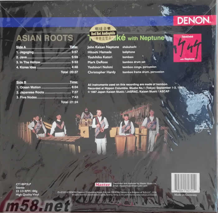 日本傳統樂器尺八是一個有九個竹節,開有五個指孔,外加一個斜切吹口的竹管,其音色多彩,樂趣多姿,變化多端。標準尺八長一尺八分(54.5公分),其十八個族群從33.5公分到84.5公分不等,涵蓋的高低音域與音色也有所不同。「竹竹」是由日本都山流尺八「黑帶」高手John Kaizan Neptune領軍,集合尺八竹笛、八里竹片琴、低音竹管、竹製套鼓、剛果敲擊鼓及竹製鼓等平常極為罕見的竹製樂器,演奏12首原創音樂。這張專輯的副標「亞洲根源」,所要傳達的理念是對世界音樂與各民族的欣賞,大部分曲目均由John Neptune所譜寫,取材亞洲各地方音樂,呼應亞洲根源的標題,以融合手法帶出讓人驚艷不斷的樂曲。這張專輯是1997年在日本哥倫比亞第一錄音棚錄製,空氣感絕佳,音質音色絕美,音場定位真實,堪稱無懈可擊的完美錄音。