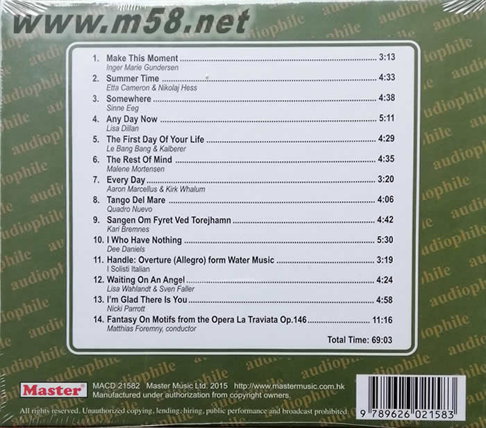1. Inger Marie Gundersen: Make This Moment 此刻情懷 2. Etta Cameron & Nikolaj Hess: Summer Time 夏日時光 3. Sinne Eeg: Somewhere 某個地方 4. Lisa Dillan: Any Day Now 現在每一天 5. Le Bang Bang & Kälberer: The First Day Of Your Life 你人生中的第一天 6. Malene Mortensen: The Rest Of Mind 殘余的心 7. Aaron Marcellus & Kirk Whalum: Every Day 愛妳的每一天 8. Quadro Nuevo: Tango Del Mare 迪馬爾探戈 9. Kari Bremnes: Sangen Om Fyret Ved Tornehamn 聽Tornehamn的燈塔在唱歌 10. Dee Daniels: I Who Have Nothing 什么都沒有的我 11. I Solisti Italiani / Handle: Overture (Allegro) from Water Music 韓德爾:水上音樂 12. Lisa Wahlandt & Sven Faller: Waiting On An Angel 等待天使 13. Nicki Parrott: I’m Glad There Is You 樂在有你 14. Matthias Foremny (conductor): Fantasy On Motifs from the Opera La Traviata Op.146 茶花女幻想曲