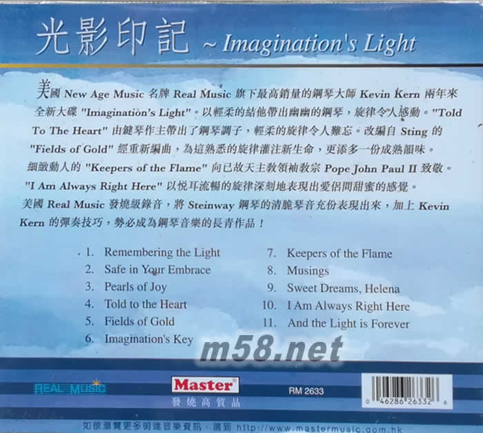 光影印記IMAGINATION’S LIGHT 新世紀純音樂(m58.net) 鋼琴大師Kevin Kern全新大碟。優美的琴音帶領聽眾進入深深的回憶之中,旋律令人感動。改編自Sting 的 Fields of Gold,更添多一份成熟韻味。發燒級錄音,將 Steinway鋼琴的清脆琴音充分表現出來!