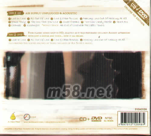 DISC 1-CD AIR SUPPLY UNPLUGGED & ACOUSTIC 01. Lost in Love 02. All Out Of Love 03. Love Other Bruises 04. Making Love Out Of Nothing At All 05. Yours Truly 06. The One That You Love 07. Sweet Dreams 08. Two Less Lonely People 09. Here I Am 10. Chances 11. Goodnight BONUS TRACK All Out of Love with The celtic Tenors DISC 2-DVD FOUR CLASSIC SONGS SHOT IN HD,EXACTLY AS IT WAS PERFORMED ON A HOT AUGUST AFTERNOON WITH JUST A GUITAR AND VOICE...HOW IT ALL BEGAN. 01. Lost In Love 02. All Out Of Love 03. Love Other Bruises 04. Making Love Out Of Nothing At All PLUS BEHIND THE SCENES RECORD OF THREE DECADES OF AIR SUPPLY MAGIC.
