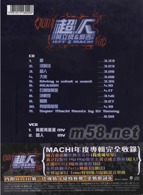 價格為估,以實到貨為準! 超人(預購專屬限量版)(m58.net) 預購專屬MACHI影音獨享AVCD 內附MACHI第三代成員介紹寫真冊+涂鴉歌詞本 VCD 超值加贈 古今嘻哈大片[我愛周星星] 耗時8個月制作3D動畫MV 超人 超人CD+VCD 貫穿古今/橫跨東西/四海麻吉/天下嘻哈 10首重量級創作單曲+2首經典話題MUSIC VIDEO+全長9分鐘SUPER MACHI REMIX