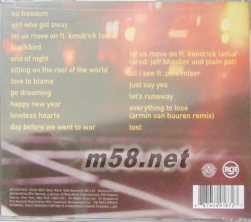 1. No Freedom Armstrong/Nowels 2. Girl Who Got Away Armstrong/Armstrong 3. Let Us Move On Armstrong/Armstrong 4. Blackbird Armstrong/Armstrong 5. End of Night Armstrong/Kurstin 6. Sitting on the Roof of the World Armstrong/Armstrong 7. Love to Blame Armstrong/Armstrong 8. Go Dreaming Armstrong/Armstrong 9. Happy New Year Armstrong/Armstrong 10. Loveless Hearts Armstrong/Armstrong 11. Day Before We Went to War Armstrong/Armstrong 12. Let Us Move On [Version] Armstrong/Armstrong 13. All I See Armstrong/Ho 14. Just Say Yes Armstrong/Armstrong 15. Let's Runaway Armstrong/Kurstin 16. Everything to Lose [Armin Van Buuren Remix] Armstrong/Armstrong 17. Lost Armstrong/Brion/Cha