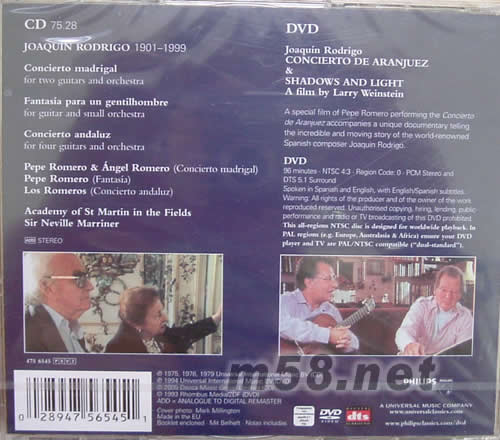 請觀看背面大圖 SHDOW AND LIGHT FILM這段影片從不同的視角回顧了羅德里戈九十年的輝煌音樂成就。一位盲人音樂家在世界范圍內(nèi)受到如此的矚目、尊敬、和愛戴,帶著傳奇和神秘的色彩。羅德里戈的女兒和佩佩·羅梅羅、指揮家雷蒙德·卡爾卡拉夫特(Raymond Calcraft)分別講述了他們眼中的羅德里戈。