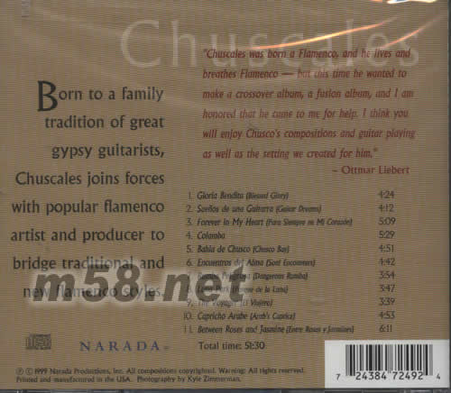 美國新世紀音名廠NARADA 靚聲泡制。出生自吉卜賽著名音樂世家的結他大師荷西·威利,以祖傳絕技SHOW QUALI彈奏八首傳統吉卜賽結他舞曲音樂,OTTMAR LIEBERT臨制,24比特靚絕錄音,保證令人雀躍起舞!