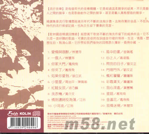 價格為估,以實(shí)到貨為準(zhǔn)! 歌林國語精選 回憶錄 3(m58.net) 【流行音樂】是每個年代的音樂精髓,它是經(jīng)過溫柔競爭的結(jié)果,不只是藝人之間的競爭,也是歌曲創(chuàng)作之間的競爭,甚至是藝人風(fēng)格塑造的競爭。 精選集是流行歌壇歷經(jīng)歲月年代不斷的浪淘沙盡,去無存菁的金晶,不但為時代的流行保留記錄,也為文化留下寶貴的見證。 【歌林國語精選回憶錄】經(jīng)歷萬千歌迷不斷的淘洗所留下的經(jīng)典作品。它不只是一首好聽的歌曲,可貴的是依附在詞曲音符里的情感、生活、情趣,歷歷在目,點(diǎn)滴心頭。它所帶給我們愉快的回憶歷久彌新,值得珍藏 。
