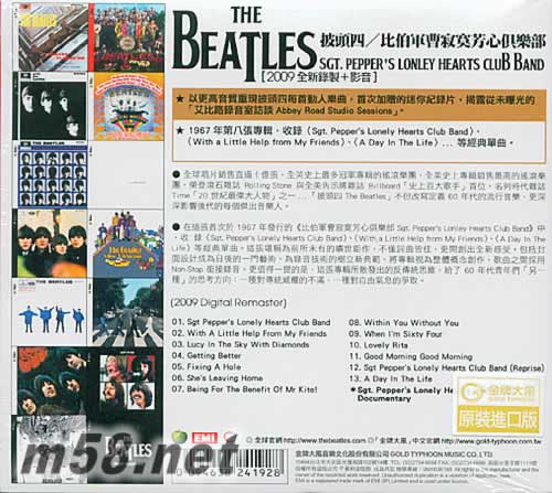 比伯軍曹寂寞芳心俱樂(lè)部 臺(tái)灣版(m58.net) ◎ 2009年流行樂(lè)壇最大盛事!披頭四The Beatles全系列專輯,全新數(shù)位錄製+影音,09.09.09全球同步發(fā)行 ◎ 以更高音質(zhì)重現(xiàn)披頭四每首動(dòng)人樂(lè)曲,首次加贈(zèng)的迷你紀(jì)錄片,揭露從未曝光的「艾比路錄音室訪談Abbey Road Studio Sessions」 ◎ Digisleeve豪華包裝、首批限定!1967年第八張專輯,收錄〈Sgt. Pepper's Lonely Hearts Club Band〉、〈With a Little Help from My Friends〉、〈A Day In The Life〉...等經(jīng)典單曲 2009年流行樂(lè)壇的最大盛事,首推位居史上最成功的搖滾團(tuán)體、並締造出無(wú)數(shù)英美排行紀(jì)錄的「披頭四The Beatles」,將發(fā)行全系列專輯的全新數(shù)位錄製版本2009 Digital Remaster! 全球唱片銷(xiāo)售直逼十億張,全英史上最多冠軍專輯的搖滾樂(lè)團(tuán),全美史上專輯銷(xiāo)售最高的搖滾樂(lè)團(tuán),榮登滾石雜誌Rolling Stone與全美告示牌雜誌Billboard「史上百大歌手」首位、名列時(shí)代雜誌Time「20世紀(jì)最偉大人物」之一...披頭四不但改寫(xiě)定義60年代的流行音樂(lè),更深深影響后代的每個(gè)杰出音樂(lè)人。 13張披頭四的歷年經(jīng)典與一張雙碟精選輯,在2009全新數(shù)位錄製的版本中,不但經(jīng)過(guò)最新科技處理、以更高音質(zhì)重現(xiàn)披頭四每首動(dòng)人樂(lè)曲,並且透過(guò)在每張專輯里、所附贈(zèng)Quicktime格式的迷你紀(jì)錄片,將帶領(lǐng)樂(lè)迷見(jiàn)證從未曝光過(guò)的「艾比路錄音室訪談Abbey Road Studio Sessions」!此外,在此次系列發(fā)行的「首批」專輯,更採(cǎi)左右對(duì)開(kāi)的Digisleeve豪華包裝,完美典藏專輯CD以及加贈(zèng)珍稀照片與背景說(shuō)明的精美寫(xiě)真。 在這張首次於1967年發(fā)行的《比伯軍曹寂寞芳心俱樂(lè)部Sgt. Pepper's Lonley Hearts Club Band》中,收錄〈Sgt. Pepper's Lonely Hearts Club Band〉、〈With a Little Help from My Friends〉、〈A Day In The Life〉等經(jīng)典單曲。這張堪稱為前所未有的曠世鉅作,不僅詞曲皆佳,更開(kāi)創(chuàng)出全新感受。包括封面設(shè)計(jì)成為日后的一門(mén)藝術(shù)、為錄音技術(shù)的樹(shù)立新典范、將專輯視為整體概念創(chuàng)作、歌曲之間採(cǎi)用Non-Stop銜接錄音。更值得一提的是,這張專輯所散發(fā)出的反傳統(tǒng)思維,給了60年代青年們「另一種」的思考方向:一種對(duì)傳統(tǒng)威權(quán)的不滿,一種對(duì)自由氣息的爭(zhēng)取。