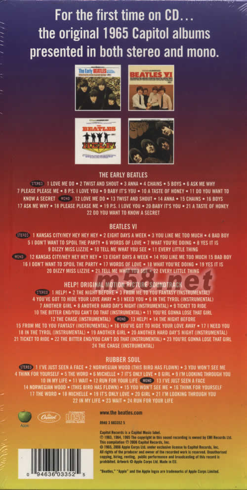 First Time Ever on CD…THE EARLY BEATLES, BEATLES VI, HELP! Motion Picture Soundtrack & the American version of RUBBER SOUL Digitally Remastered & presented in both Stereo and Mono Special packaging includes original album cover artwork and 60-page collector's booklet with rare photos