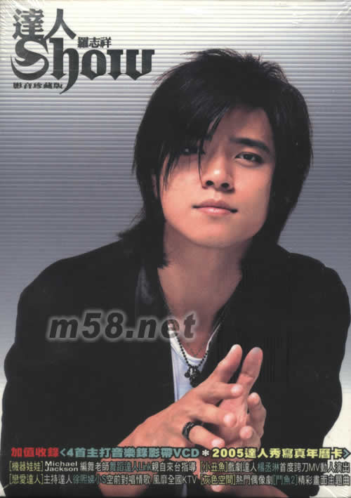 達人Show (影音珍藏版)(m58.net) 加值收錄(4首主打音樂錄影帶VCD 2005達人秀寫真年歷卡) [機器娃娃]MICHAEL JACKSON 編舞老師舞蹈達人LINK親自來臺指導 [小丑魚]戲劇達人楊丞琳首度跨刀MV動人演出 [戀愛達人]主持達人徐熙娣小S空前對唱情歌 風靡全國KTV [灰色空間]熱門偶像劇[斗魚 2]精彩畫面主題曲 舞臺全能小霸王 橫跨歌唱主持戲劇 實力偶你三冠王 羅志祥SHOW第二張音樂力作 達人SHOW 金曲獎音樂達人阿弟仔 陳子鴻 等人聯(lián)手打造 10首穿越時空音樂愛情羅曼史