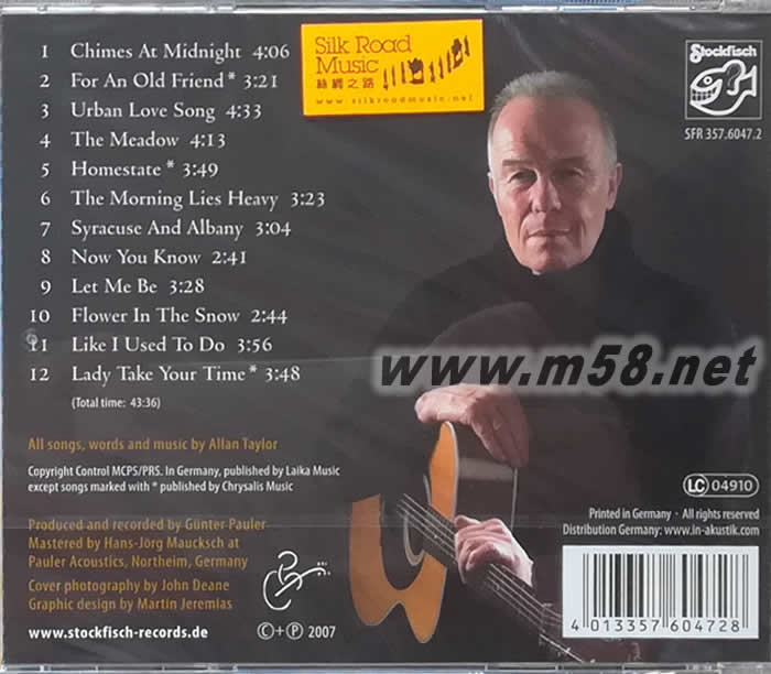 Old Friends-New Roads 舊朋友 新的路(m58.net) 被譽為最完美的唱作歌手阿倫泰勒(Allan Taylor)闊別樂壇四年后,最新專輯[舊朋友-新的路]。再次發揮吟游詩人的魅力,以其淳厚穩重的歌聲輕輕細訴著這些年來的感受與經歷,結他弦聲依舊清脆攝人!更首度與鋼琴大師武勒(Lutz Moller)合作,讓阿倫泰勒表現出最溫柔深情的一面,令您難舍難離地沉醉在他那沉實優雅的旋律之中!