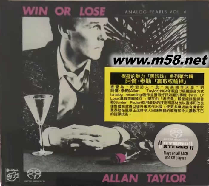 模擬的魅力「黑珍珠」系列第六輯 贏與輸 [Win or Lose]Analog Pearls Vol. 6 SACD(m58.net) 1. 被譽為吟游詩人及完美唱作天皇的阿倫.泰勒(Allan Taylor)以其沉實雄渾,感性中帶著風霜的聲線征服了無數樂迷,配合冼煉的歌唱技巧,被視為「發燒男聲」之翹楚,雄視樂壇超越五十年。 2. 泰勒與發燒錄音名牌「老虎魚(Stockfisch Records)」合作達二十五年,共同創造出多個使樂迷津津樂道的經典專輯,是高質素美樂錄音的保証。泰勒在其音樂旅程穩定基石后的初期,曾於一九八四年親自以模擬錄音方式(analog recording)製作專輯《Win Or Lose (贏取或輸掉)》,在當時出版后無論是歌曲的動聽性,他唱功的表現和錄音效果皆獲得好評如潮。他為了與「老虎魚」的合作達入新的里程碑,與錄音大師古達‧普勒(Günter Pauler)商討,由泰勒提供這專輯的原裝模擬母盤,而普勒採用最新的技術和器材加以復修和改良使整體音效得以提升后再作出版,使更多樂迷能有機會欣賞泰勒在風華正茂時令人回味無窮的歌聲和令人讚嘆不已的指彈技術。 3. 專輯內的十一首歌曲全是泰勒的精心杰作,由他親自演繹更為傳神,配合多位當時能獨當一面的音樂人絲絲入扣的演奏緊密地配合,每首樂曲皆以賞心悅耳的形態展現,將他獨有的魅力詮釋得淋漓盡致。 4. 普勒製作的母盤使原有音色得以保存時亦加以潤飾,無論是人聲或樂器聲的原來音色得已原汁原味地寄存。現以金屬直刻母盤(Direct Metal Master),180克處女黑膠盤為載體,原來音源的模擬音色更為清麗飽滿,樂器音質厚實,線條分明,人聲細致真實,是愛好聆聽模擬錄音者另一必備之選。